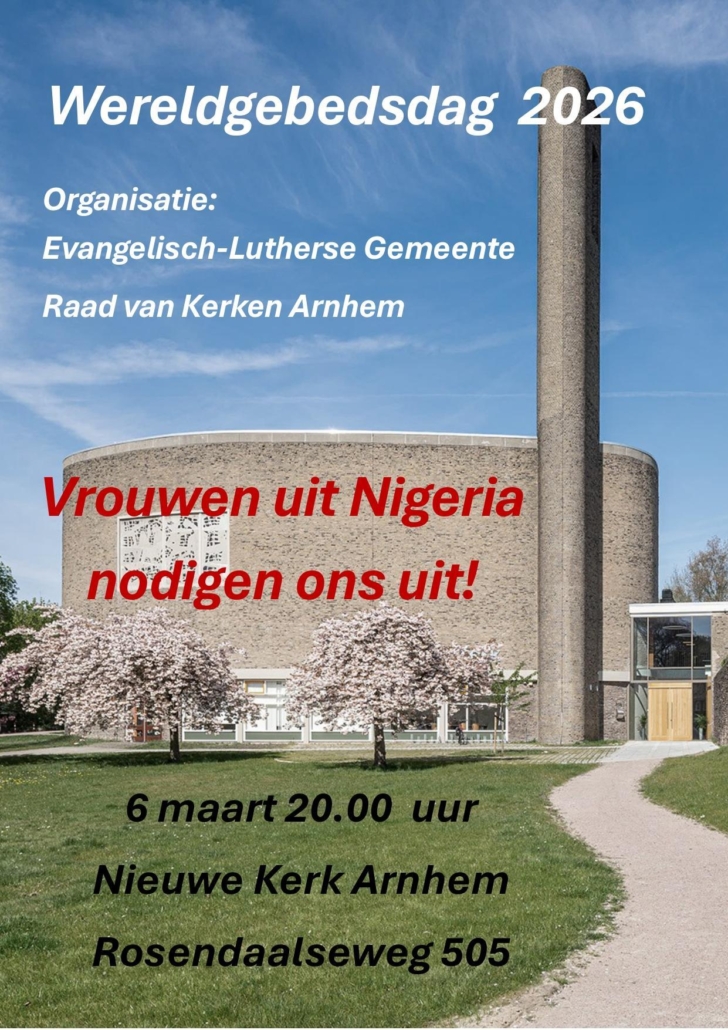 In Arnhem zal op 6 maart aanstaande om 20:00 uur in de Nieuwe Kerk aan de Rosendaalseweg een viering worden gehouden, zoals die dit jaar door vrouwen uit Nigeria is samengesteld. Na afloop is er een gezellig samenzijn, waarbij met thee en koffie met Nigeriaanse koekjes, en met een drankje kan worden nagepraat.